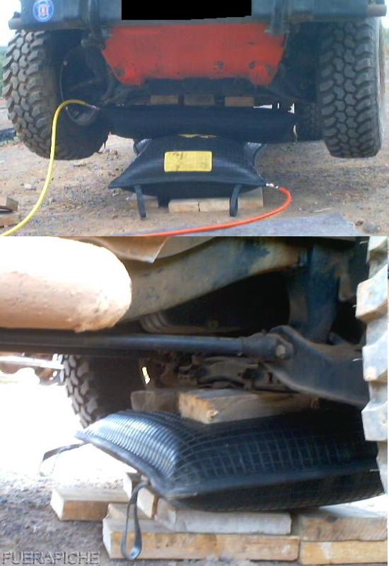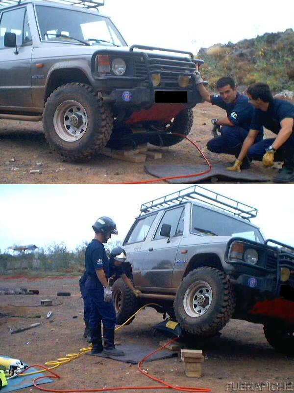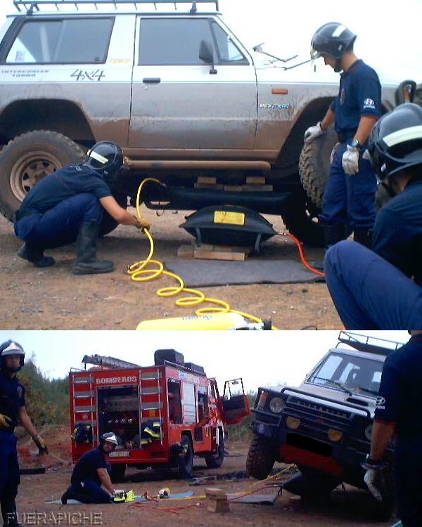 Las 3 últimas son unas practicas de bomberos usando cojines de presión con los que levantaban el Montero con 2 bar de presión y llegaban a alcanzar un máximo de 8 bar.